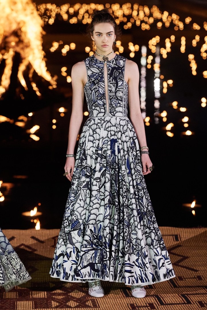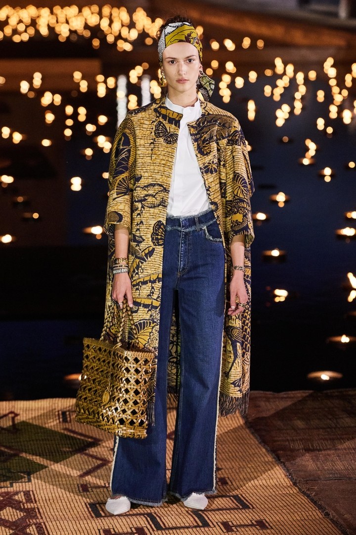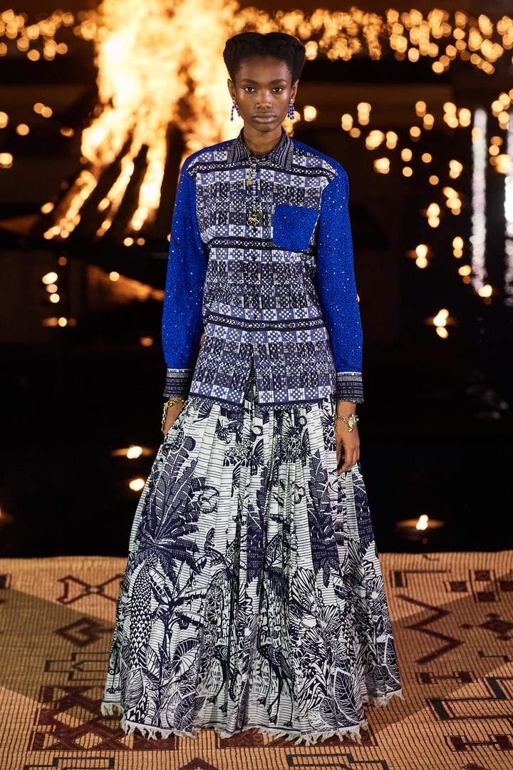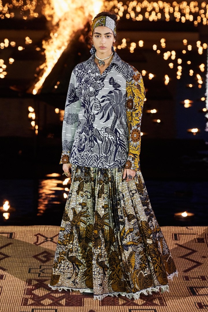 Elle a aussi collaboré avec Anne Grosfilley, une anthropologue, conservatrice, et spécialiste des textiles et de la mode en Afrique, Sumano, une association en faveur de la préservation du savoir-faire et des traditions du tissage et de la poterie de la région de l’Anti- Atlas . L’un des plus gros clins d’œil de cette collection et dont on parle un peu moins est la collaboration avec Uniwax qui a eu carte blanche pour réinterpréter les motifs toile de Jouy et cartes de tarot de la maison. Le résultat est une série de motifs oversize, déclinés dans une palette allant de l’écru (blanc) à l’indigo, en passant par l’ocre, le jaune, et le vert camouflage. Le plus marquant est que la lisière de toutes ces tenues portent l’inscription Uniwax Special Edition Christian Dior – Guaranteed Real Wax Printed in Côte d’Ivoire.